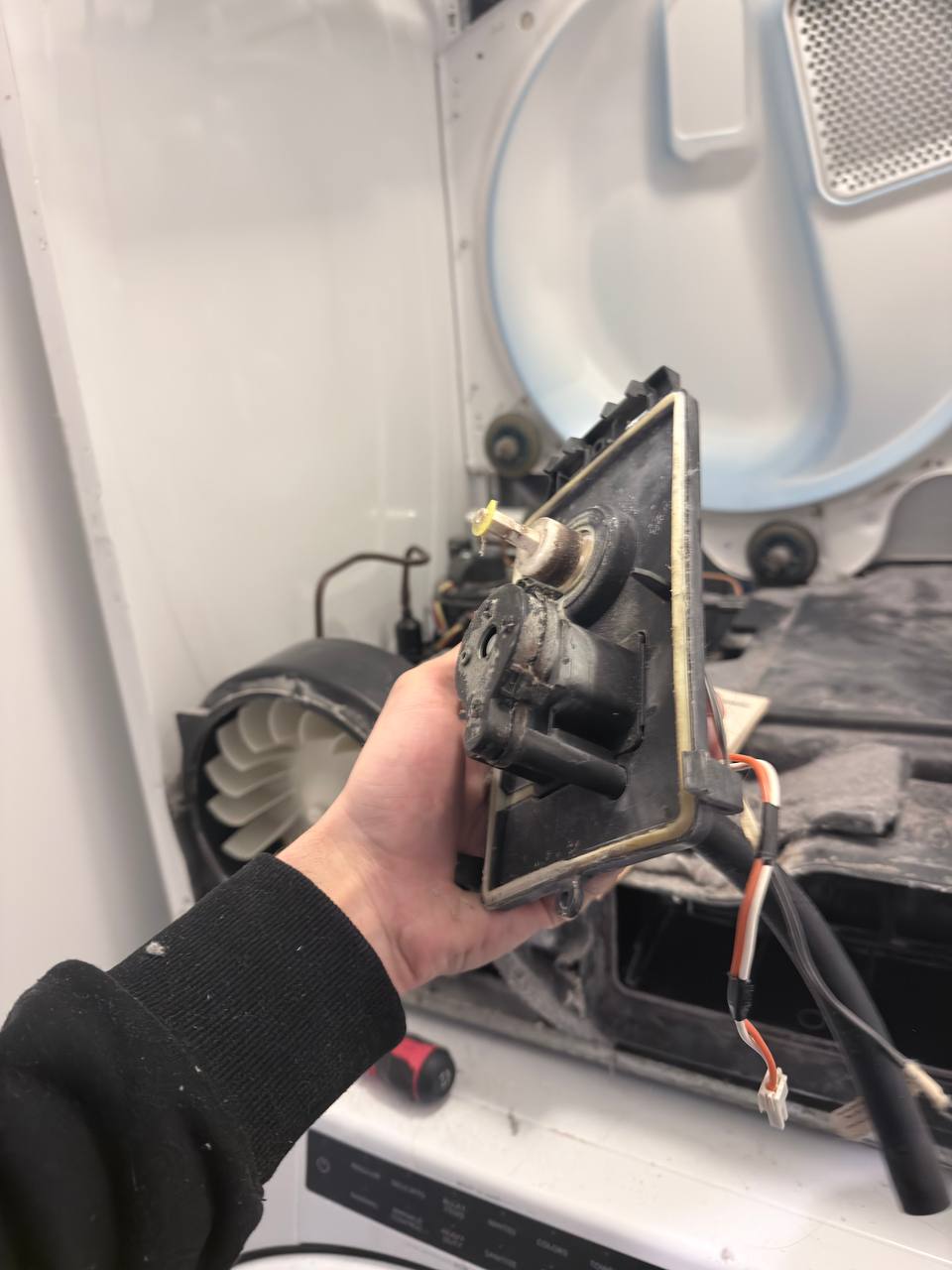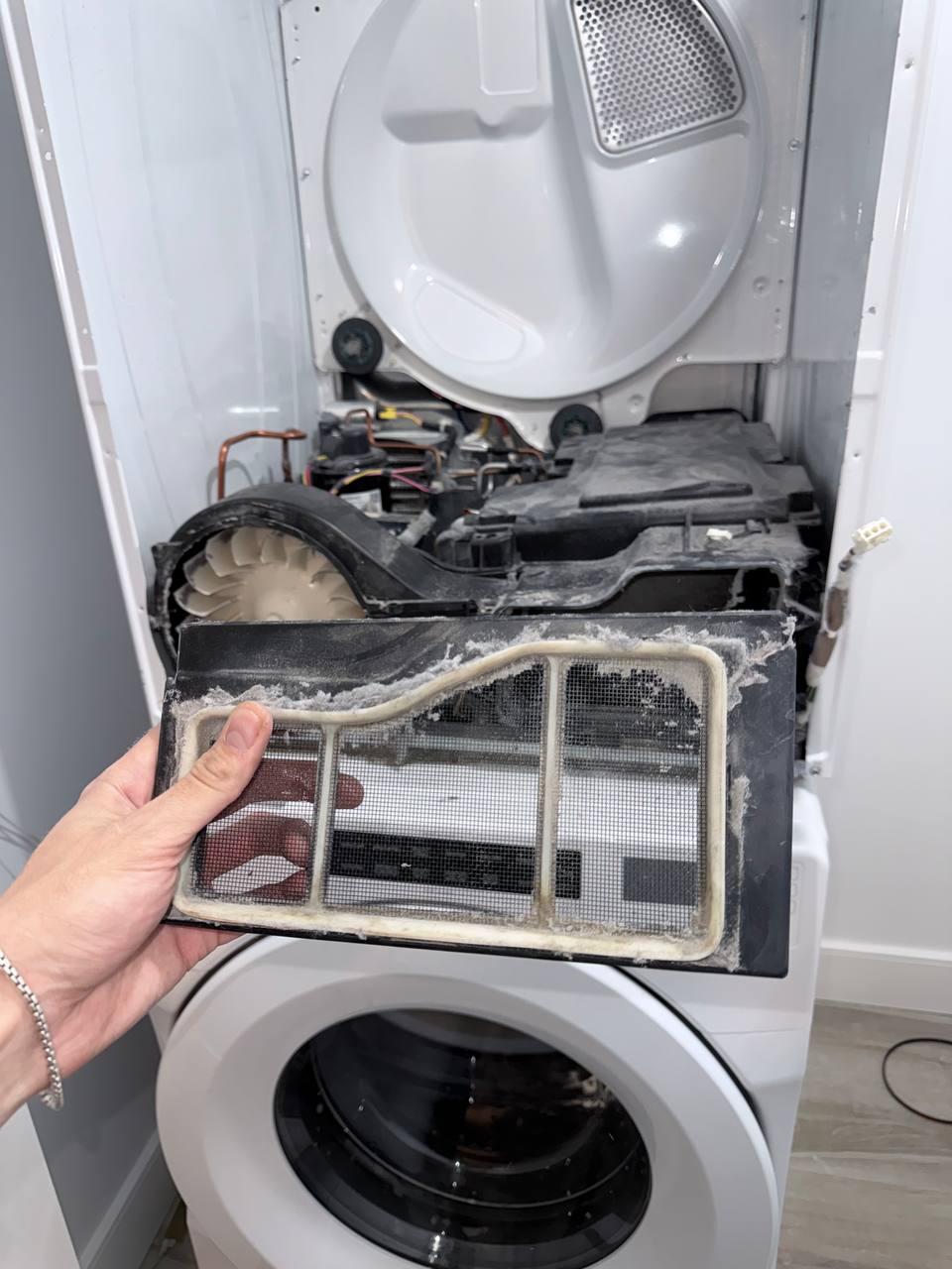 In NYC, the dryer itself is often fine. The failure chain is usually: restricted vent path (crushed duct behind the unit, long run with too many turns, blocked exterior hood) → hot wet air can’t leave → long dry times + overheating behavior → thermal protection opens and the heater gets stressed. Whirlpool explicitly flags restricted airflow with codes like AF / “Check Vent” and points to clogged lint screen/vent, crushed/kinked vent, or too many turns as the driver. (Product Help | Whirlpool)