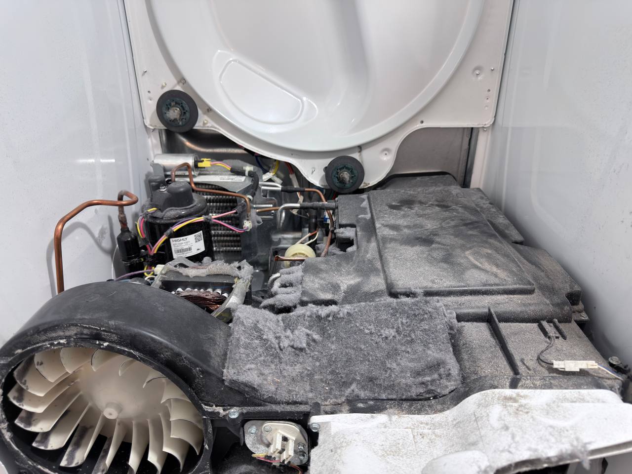 A: Restricted airflow. On vented units it’s usually a crushed/long/blocked vent path. On ventless units it’s restriction in the internal condenser/heat-exchange airflow path or a condensate handling issue that prevents moisture removal.