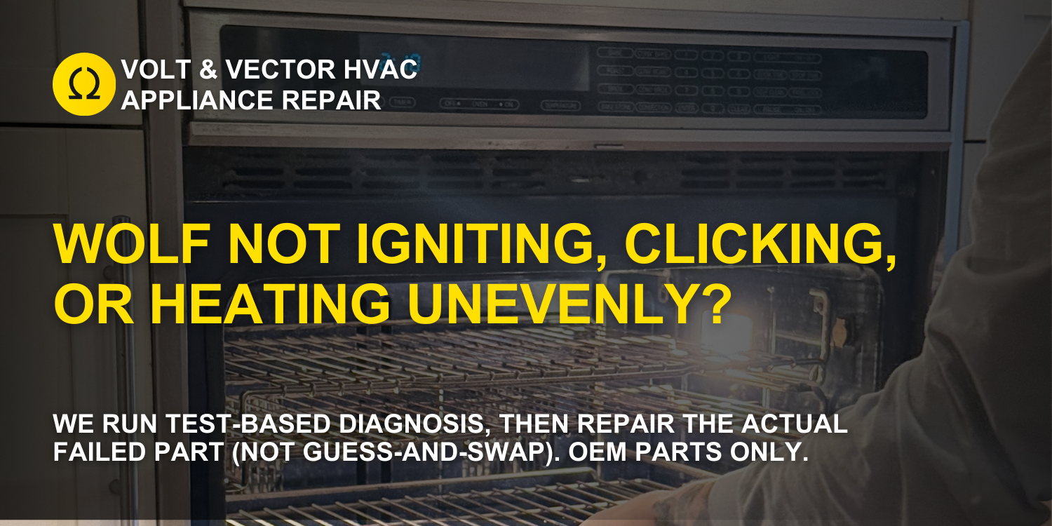 Volt & Vector is diagnostics-first. We verify actual temperatures, electrical loads, ignition behavior, airflow and draft, and control response before recommending a repair path—so you avoid wrong parts and the fix holds up during normal cooking, not just at idle.